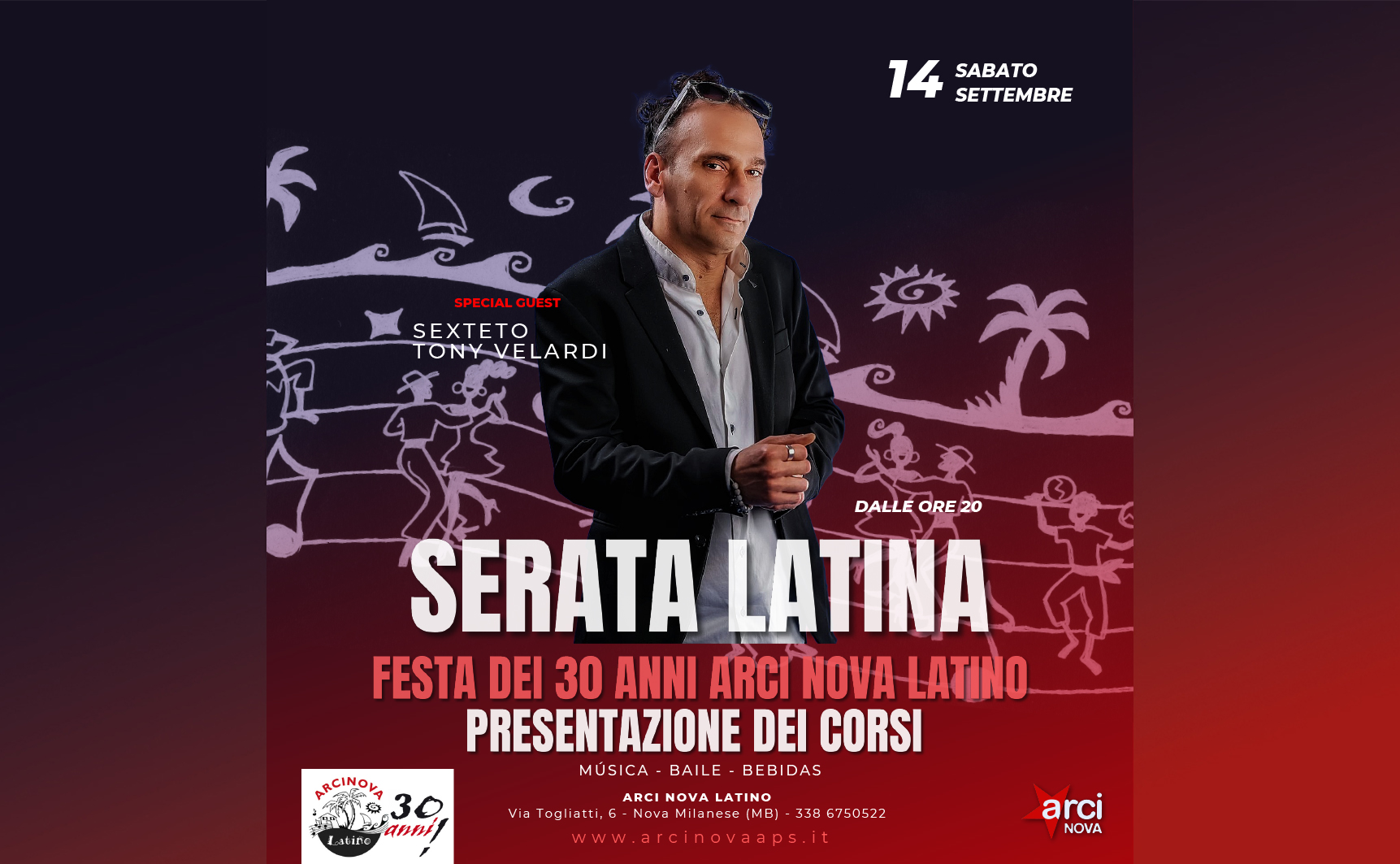 GRANDE RIAPERTURA! Cari amici di Arci Nova Latino, Siamo entusiasti di annunciare un evento imperdibile! SABATO 14 SETTEMBRE, dalle 20.00, ci ritroveremo al Circolo Arci Nova per una serata speciale in cui celebreremo insieme i 30 anni di Arci Nova Latino. Sarà un’occasione unica per incontrare vecchi amici, fare nuove conoscenze e scoprire tutte le novità dei nostri corsi latini per l’anno 2024/2025. Musica dal Vivo con il Sexteto Tony Velardi La serata sarà resa ancora più speciale dalla presenza di Tony Velardi Sexteto, che ci regalerà un’indimenticabile performance di musica