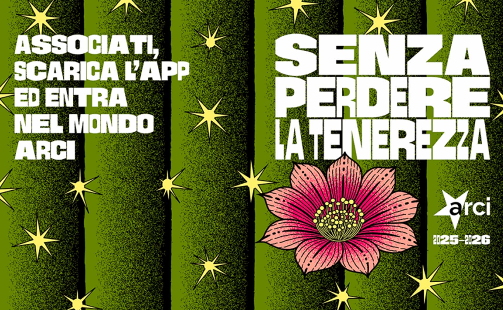 Anche per quest’anno, puoi aderire all‘Arci richiedendo di iscriverti per l'anno 2025/2026 validità 1 Ottobre/30 Settembre 2026 presso il nostro circolo costo €uro 13,00 (per minorenni € 10,00) Senza perdere la tenerezza, il messaggio è chiaro ed è la frase scelta per accompagnare la nuova tessera. Un cactus con un fiore: resistenza e delicatezza insieme, forza e gentilezza che convivono. Perché anche nei momenti più complessi, la comunità Arci continua a resistere, creare cultura e costruire legami. Scarica qui Modulo Iscrizione 2025-2026 (da compilare e portare in Arci durante
